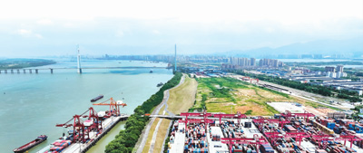 5月23日,江西九江上港集团城西港区集装箱码头,一艘艘货轮在码头泊位上有序装卸集装箱。